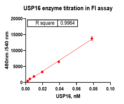 Activity Identification:The USP16 activity was quantified using a FI-based assay. The reaction was performed by incubating the USP16 protein and substrate at 25℃ for 60 min, finally measuring luminescence signal on BMG.