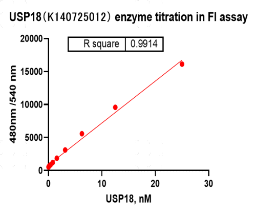 Activity Identification:The USP18 activity was quantified using a FI-based assay. The reaction was performed by incubating the USP18 protein and substrate at 25℃ for 60 min, finally measuring luminescence signal on BMG.