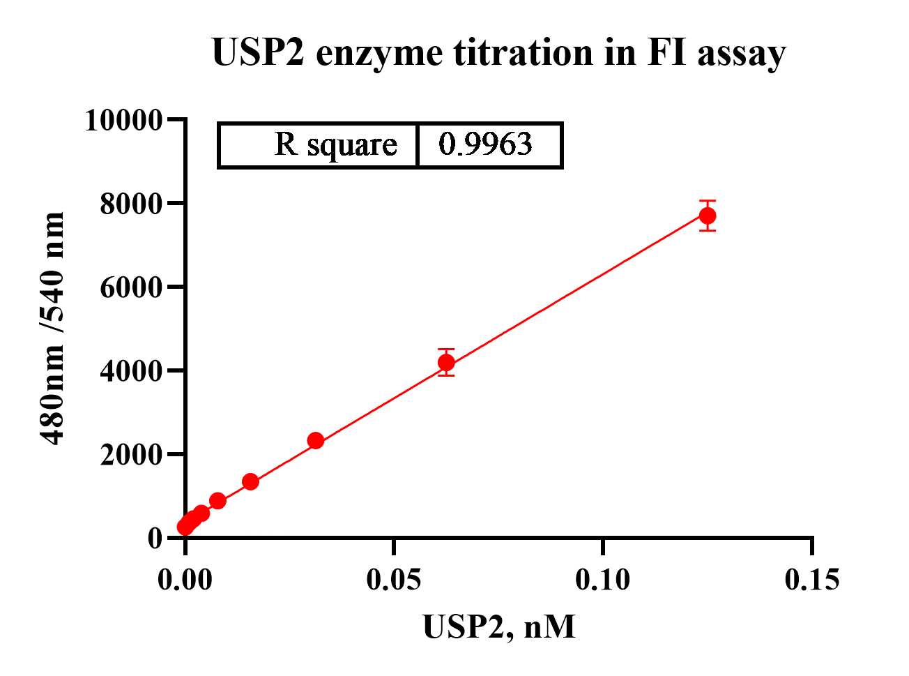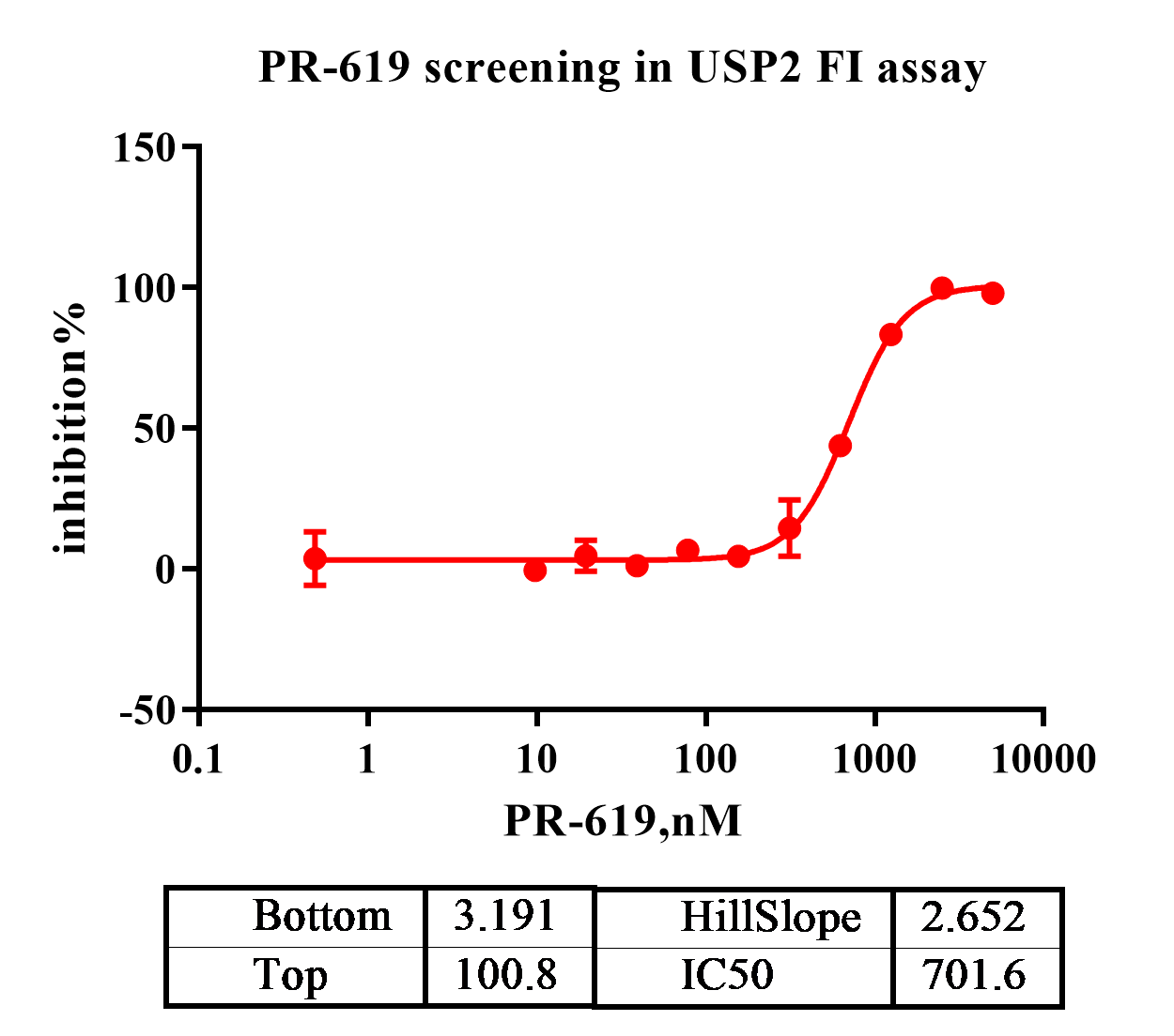 Activity Identification:The USP2 activity was detected by FI assay. The reaction was performed by incubating the USP2 protein and substrate at 25℃ for 60 min, then reading RFU with BMG.