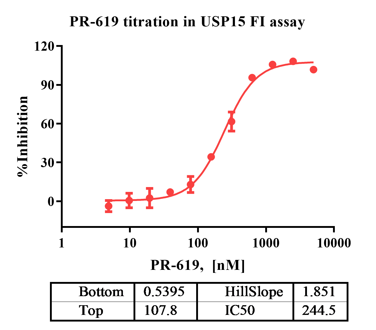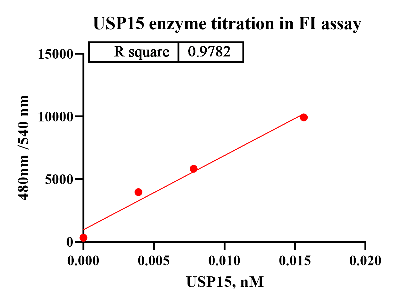 Activity Identification:The USP15 activity was detected by FI assay. The reaction was performed by incubating the USP15 protein and substrate at 25℃ for 60 min, then reading RFU with BMG.