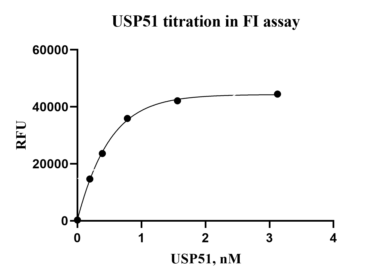 Activity Identification:The USP51 activity was detected by cleaving the fluorogenic peptide substrate in FI assay. The reaction was performed by incubating the USP51 protein and substrate at 25℃ for 60 min, then reading RFU with BMG.