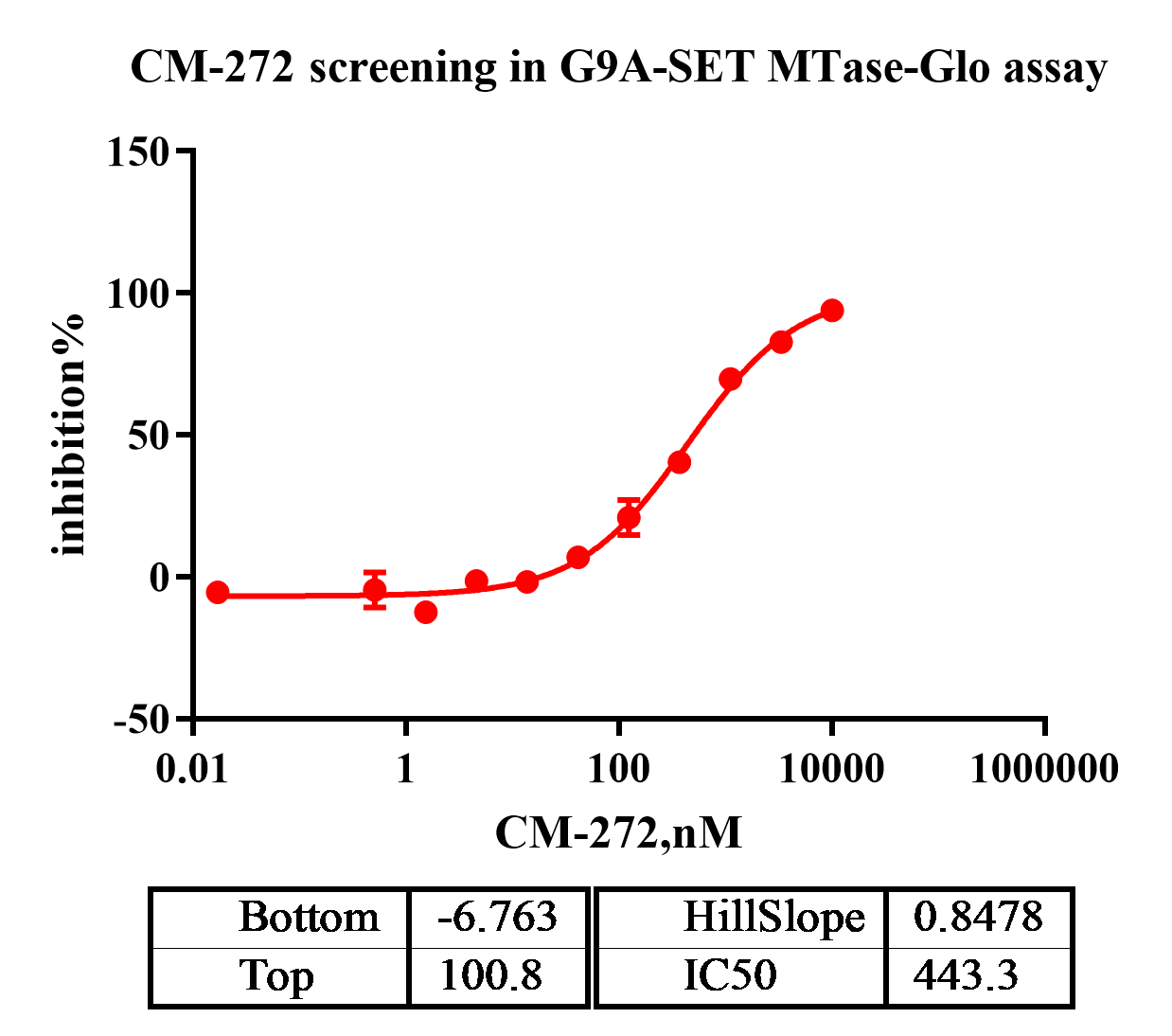 Activity Identification:The EHMT2(G9A) activity was detected using Ultra Luminescence technology. The reaction was performed by incubating the EHMT2(G9A) protein, SAM and substrate at 25℃ for 180 min, then adding MTase-Glo reagent and reading RFU with BMG.