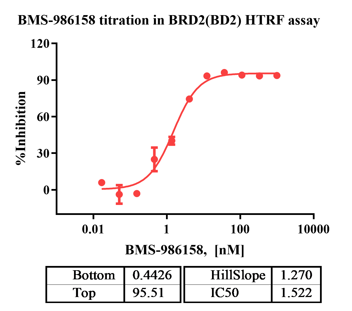Activity Identification:The BRD2(BD2) activity was detected using HTRF technology. The reaction was performed by incubating the BRD2(BD2) protein, BET and the beads at 25℃ for 60 min, then reading ratio 665/620 with BMG.