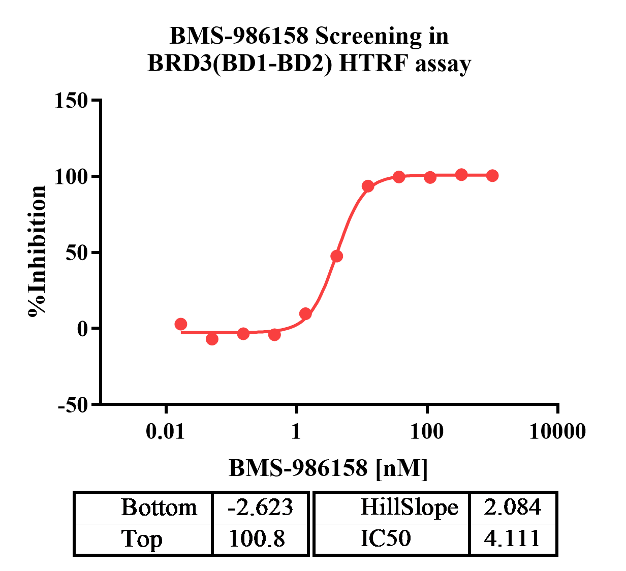 Activity Identification:The BRD3(BD1-BD2) activity was detected using HTRF technology. The reaction was performed by incubating the BRD3(BD1-BD2) protein, BET and the beads at 25℃ for 60 min, then reading ratio 665/620 with BMG.