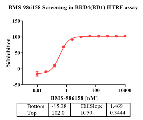 Activity Identification:The BRD4(BD1) activity was detected using HTRF technology. The reaction was performed by incubating the BRD4(BD1) protein, BET and the beads at 25℃ for 60 min, then reading ratio 665/620 with BMG.