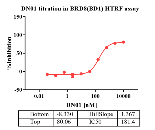 Activity Identification:The BRD8(BD1) activity was detected using HTRF technology. The reaction was performed by incubating the BRD8(BD1) protein, BET and the beads at 25℃ for 60 min, then reading ratio 665/620 with BMG.