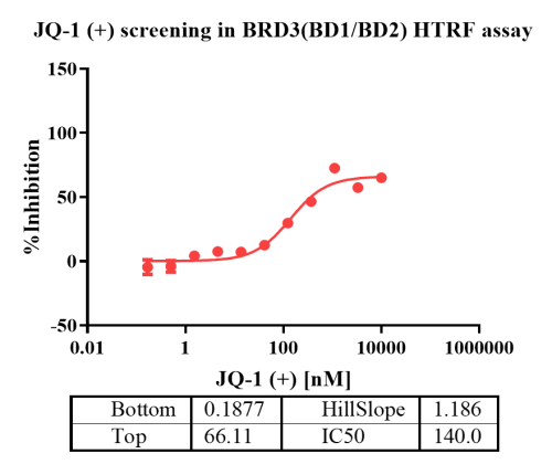Activity Identification:The BRD3(BD1/BD2) activity was detected using HTRF technology. The reaction was performed by incubating the BRD3(BD1/BD2) protein, BET and the beads at 25℃ for 60 min, then reading ratio 665/620 with BMG.