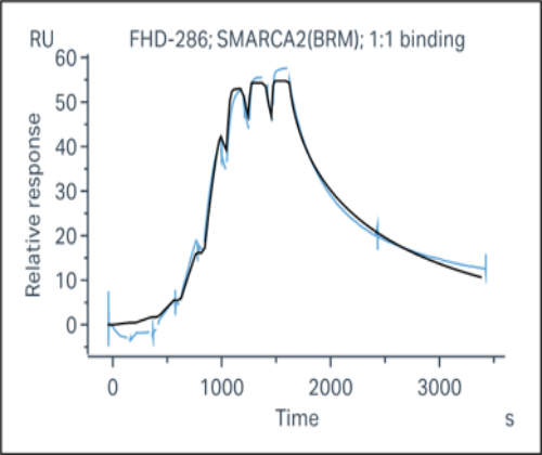 Activity Identification:The Biotin-BRM activity was detected using SPR technology. The Biotin-BRM protein was immobilized onto the SA chip coupled with neutravidin using labeled biotin. The varying concentration of FHD-286 was injected onto the Biotin-BRM protein surface, and recorded the response signal. The kinetics fitting was as follows with a kD value of ~ 4.29x10-9 M.