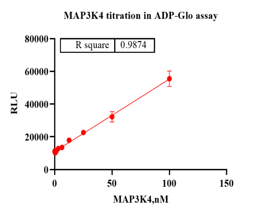 Activity Identification:The MAP3K4 activity was detected using Ultra Luminescence technology. The reaction was performed by incubating the MAP3K4 protein, ATP and substrate at 25℃ for 60 min, then adding ADP-Glo reagent and reading RLU signal with BMG.