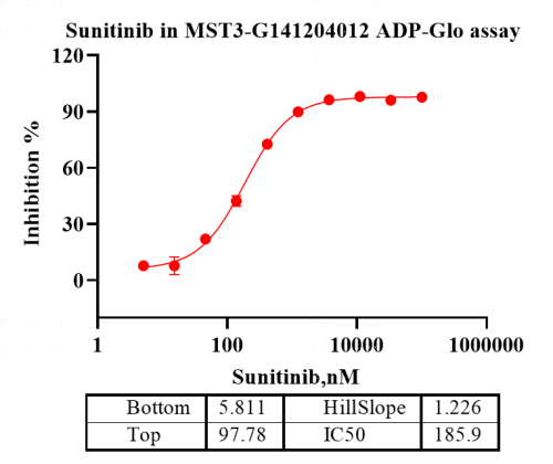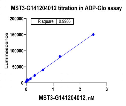 Activity Identification:The MST3 kinase activity was quantified using the ADP-Glo™ assay. The reaction was performed by incubating the MST3 protein, ATP and substrate at 25℃ for 60 min, adding ADP-Glo reagent and then measuring luminescence signal on BMG.