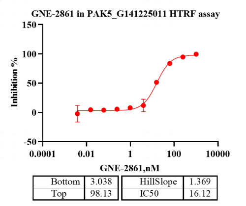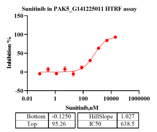 Activity Identification:The PAK5 activity was quantified using a HTRF-based assay. The reaction was performed by incubating the PAK5 protein, ATP and substrate at 25℃ for 60 min, then adding the donor and receptor, and keeping the mixture at 25℃ for 60 min, finally measuring the 665nm/620nm fluorescence signal ratio on BMG.