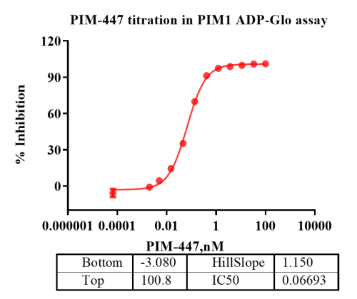 Activity Identification:The PIM1 activity was detected using Ultra Luminescence technology. The reaction was performed by incubating the PIM1 protein, ATP and substrate at 25℃ for 60 min, and adding ADP-Glo reagent at 25℃ for 40 min, then reading RLU with BMG.