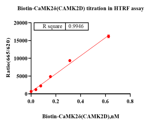 Activity Identification:The Biotin-CaMK2δ(CAMK2D) activity was detected using HTRF technology. The reaction was performed by incubating the Biotin-CaMK2δ(CAMK2D) protein, ATP and substrate at 25℃ for 60 min, adding the beads at 25℃ for 60 min, then reading ratio 665/620 with BMG.