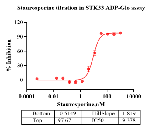 Activity Identification:The STK33 activity was detected using Ultra Luminescence technology. The reaction was performed by incubating the STK33 protein, ATP and substrate at 25℃ for 60 min, then adding ADP-Glo reagent and reading RLU signal with BMG.