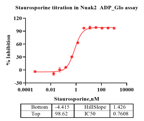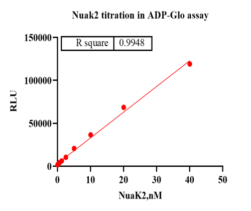 Activity Identification:The Nuak2 activity was detected using Ultra Luminescence technology. The reaction was performed by incubating the Nuak2 protein, ATP and substrate at 25℃ for 60 min, then adding ADP-Glo reagent and reading RLU signal with BMG.