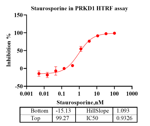 Activity Identification:The PRKD1 activity was detected using HTRF technology. The reaction was performed by incubating the PRKD1 protein, ATP and substrate at 25℃ for 60 min, adding the beads at 25℃ for 60 min, then reading ratio 665/620 with BMG.