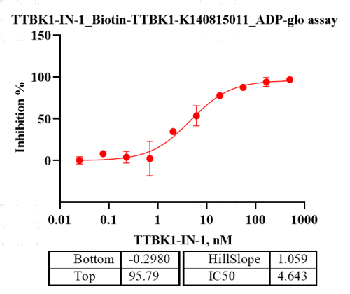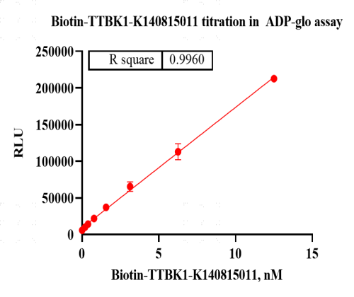 Activity Identification:The Biotin-TTBK1 kinase activity was quantified using the ADP-Glo™ assay. The reaction was performed by incubating the Biotin-TTBK1 protein, ATP and substrate at 25℃ for 60 min, adding ADP-Glo reagent and then measuring luminescence signal on BMG.
