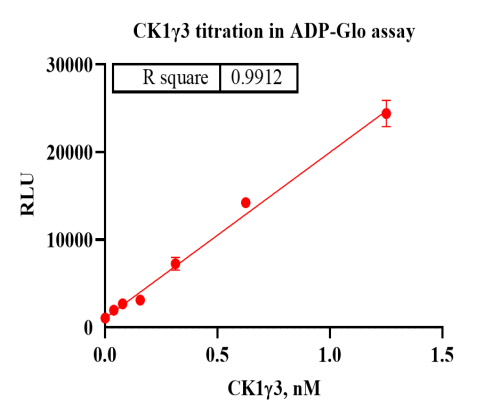 Activity Identification:The CK1γ3 activity was detected using Ultra Luminescence technology. The reaction was performed by incubating the CK1γ3 protein, ATP and substrate at 25℃ for 60 min, then adding ADP-Glo reagent and reading RLU signal with BMG.