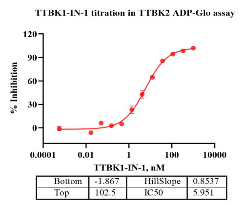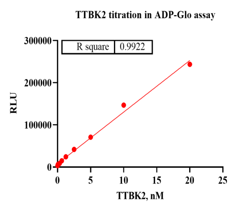 Activity Identification:The TTBK2 activity was detected using Ultra Luminescence technology. The reaction was performed by incubating the TTBK2 protein, ATP and substrate at 25℃ for 60 min, then adding ADP-Glo reagent and reading RLU signal with BMG.