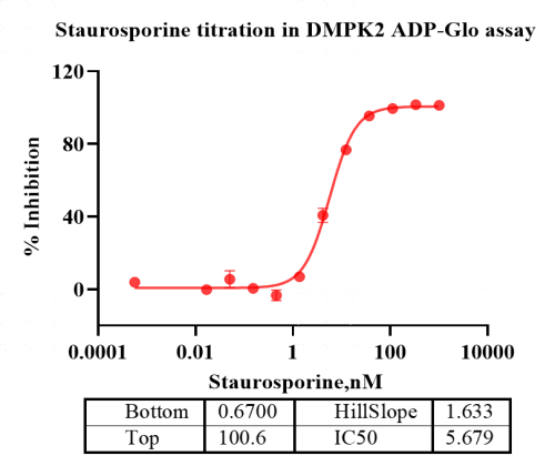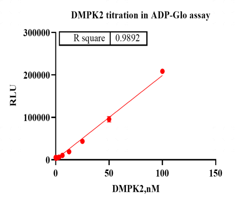 Activity Identification:The DMPK2 activity was detected using Ultra Luminescence technology. The reaction was performed by incubating the DMPK2 protein, ATP and substrate at 25℃ for 60 min, then adding ADP-Glo reagent and reading RLU signal with BMG.