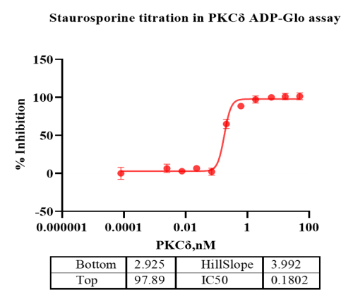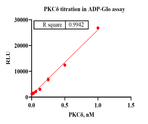 Activity Identification:The PKCδ activity was detected using Ultra Luminescence technology. The reaction was performed by incubating the PKCδ protein, ATP and substrate at 25℃ for 60 min, then adding ADP-Glo reagent and reading RLU signal with BMG.