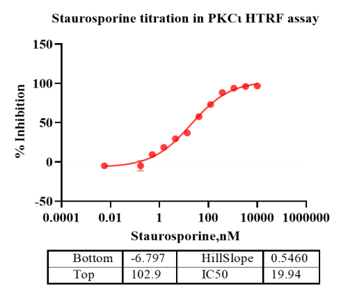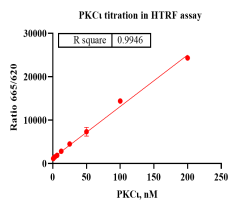 Activity Identification:The PKCι activity was detected using HTRF technology. The reaction was performed by incubating the PKCι protein, ATP and substrate at 25℃ for 60 min, adding the beads at 25℃ for 60 min, then reading ratio 665/620 with BMG.