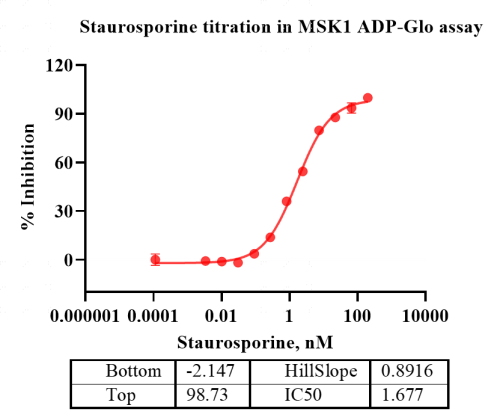 Activity Identification:The MSK1 activity was detected using Ultra Luminescence technology. The reaction was performed by incubating the MSK1 protein, ATP and substrate at 25℃ for 60 min, then adding ADP-Glo reagent and reading RLU signal with BMG.