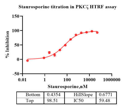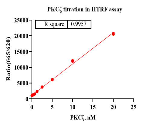 Activity Identification:The PKCζ activity was detected using HTRF technology. The reaction was performed by incubating the PKCζ protein, ATP and substrate at 25℃ for 60 min, adding the beads at 25℃ for 60 min, then reading ratio 665/620 with BMG.