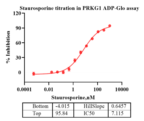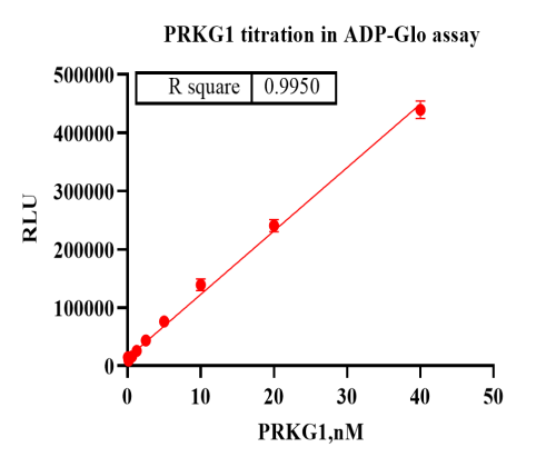 Activity Identification:The PRKG1 activity was detected using Ultra Luminescence technology. The reaction was performed by incubating the PRKG1 protein, ATP and substrate at 25℃ for 60 min, then adding ADP-Glo reagent and reading RLU signal with BMG.