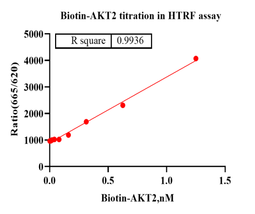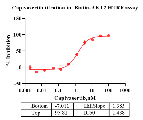 Activity Identification:The Biotin-AKT2 activity was detected using HTRF technology. The reaction was performed by incubating the Biotin-AKT2 protein, ATP and substrate at 25℃ for 60 min, adding the beads at 25℃ for 60 min, then reading ratio 665/620 with BMG.