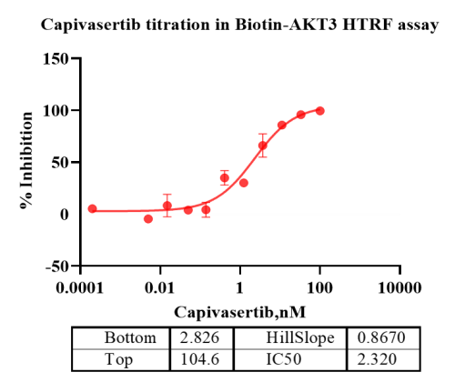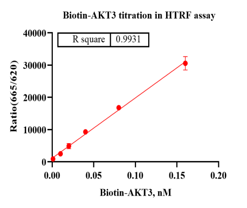Activity Identification:The Biotin-AKT3 activity was detected using HTRF technology. The reaction was performed by incubating the Biotin-AKT3 protein, ATP and substrate at 25℃ for 60 min, adding the beads at 25℃ for 60 min, then reading ratio 665/620 with BMG.