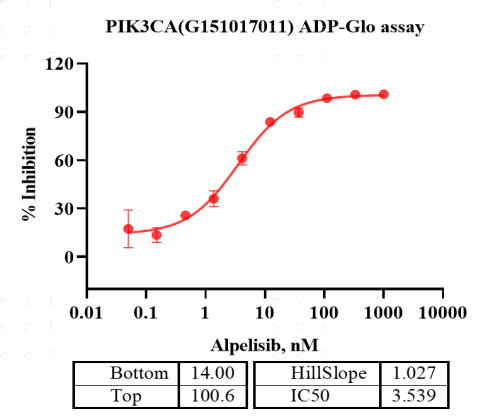 Activity Identification:The PIK3CA/PIK3R1 activity was activity was quantified using the ADP-Glo™ assay. The reaction was performed by incubating the PIK3CA/PIK3R1 protein, ATP and substrate at 25℃ for 60 min, adding ADP-Glo reagent and then measuring luminescence signal on BMG.