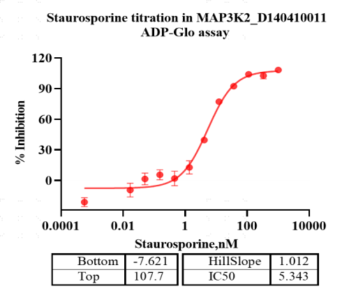 Activity Identification:The MAP3K2 kinase activity was quantified using the ADP-Glo™ assay. The reaction was performed by incubating the MAP3K2 protein, ATP and substrate at 25℃ for 60 min, adding ADP-Glo reagent and then measuring luminescence signal on BMG.