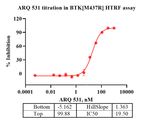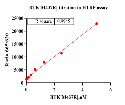 Activity Identification:The BTK[M437R] activity was detected using HTRF technology. The reaction was performed by incubating the BTK[M437R] protein, ATP and substrate at 25℃ for 50 min, adding the beads at 25℃ for 60 min, then reading ratio 665/620 with BMG.