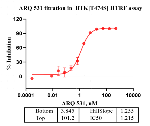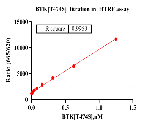 Activity Identification:The BTK[T474S] activity was detected using HTRF technology. The reaction was performed by incubating the BTK[T474S] protein, ATP and substrate at 25℃ for 60 min, adding the beads at 25℃ for 60 min, then reading ratio 665/620 with BMG.