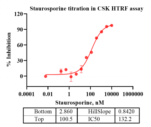 Activity Identification:The CSK activity was detected using HTRF technology. The reaction was performed by incubating the CSK protein, ATP and substrate at 25℃ for 60 min, then reading ratio 665/620 with BMG.