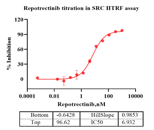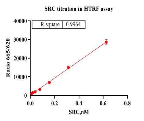 Activity Identification:The Src activity was detected using HTRF technology. The reaction was performed by incubating the Src protein, ATP and substrate at 25℃ for 60 min, adding the beads at 25℃ for 60 min, then reading ratio 665/620 with BMG.