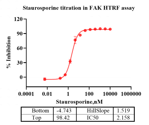 Activity Identification:The FAK activity was detected using HTRF technology. The reaction was performed by incubating the FAK protein, ATP and substrate at 25℃ for 60 min, adding the beads at 25℃ for 60 min, then reading ratio 665/620 with BMG.