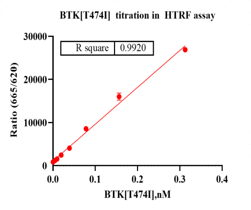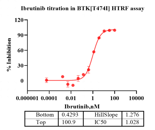 Activity Identification:The BTK[T474I] activity was detected using HTRF technology. The reaction was performed by incubating the BTK[T474I] protein, ATP and substrate at 25℃ for 60 min, adding the beads at 25℃ for 60 min, then reading ratio 665/620 with BMG.