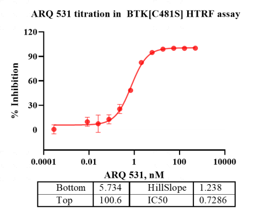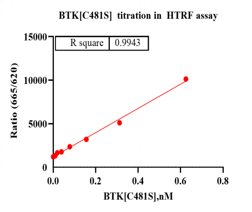 Activity Identification:The BTK[C481S] activity was detected using HTRF technology. The reaction was performed by incubating the BTK[C481S] protein, ATP and substrate at 25℃ for 60 min, adding the beads at 25℃ for 60 min, then reading ratio 665/620 with BMG.