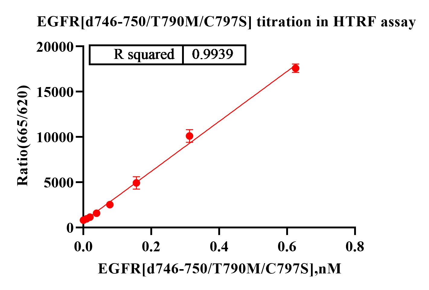 Description:Recombinant human EGFR[d746-750/T790M/C797S] protein with N-terminal GST tag was purified by GST affinity and followed by SEC chromatography. The EGFR[d746-750/T790M/C797S] protein showed high activity in HTRF assay.