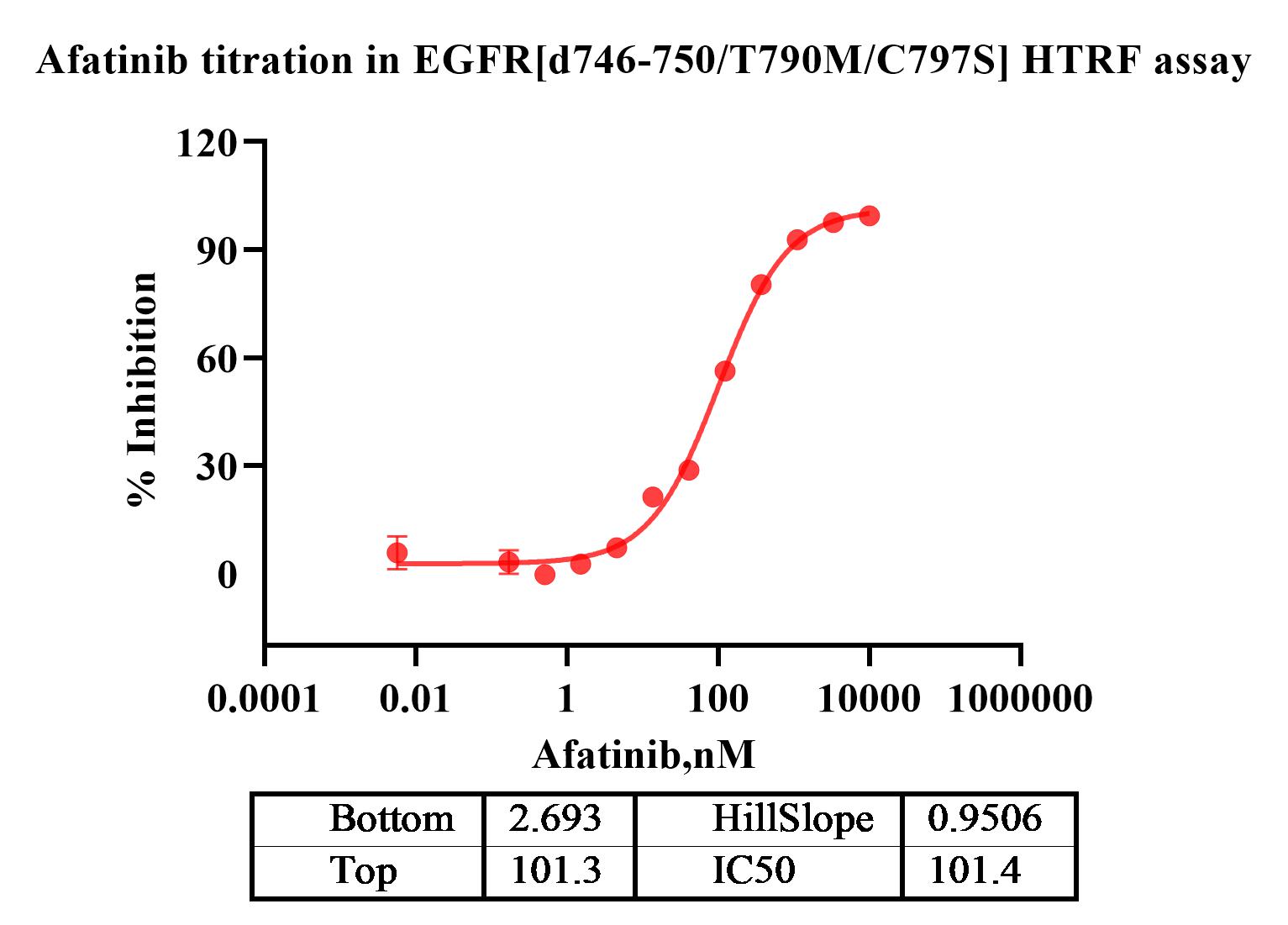 Activity Identification:The EGFR[d746-750/T790M/C797S] activity was detected using HTRF technology. The reaction was performed by incubating the EGFR[d746-750/T790M/C797S] protein, ATP and substrate at 25℃ for 60 min, adding the beads at 25℃ for 60 min, then reading ratio 665/620 with BMG.