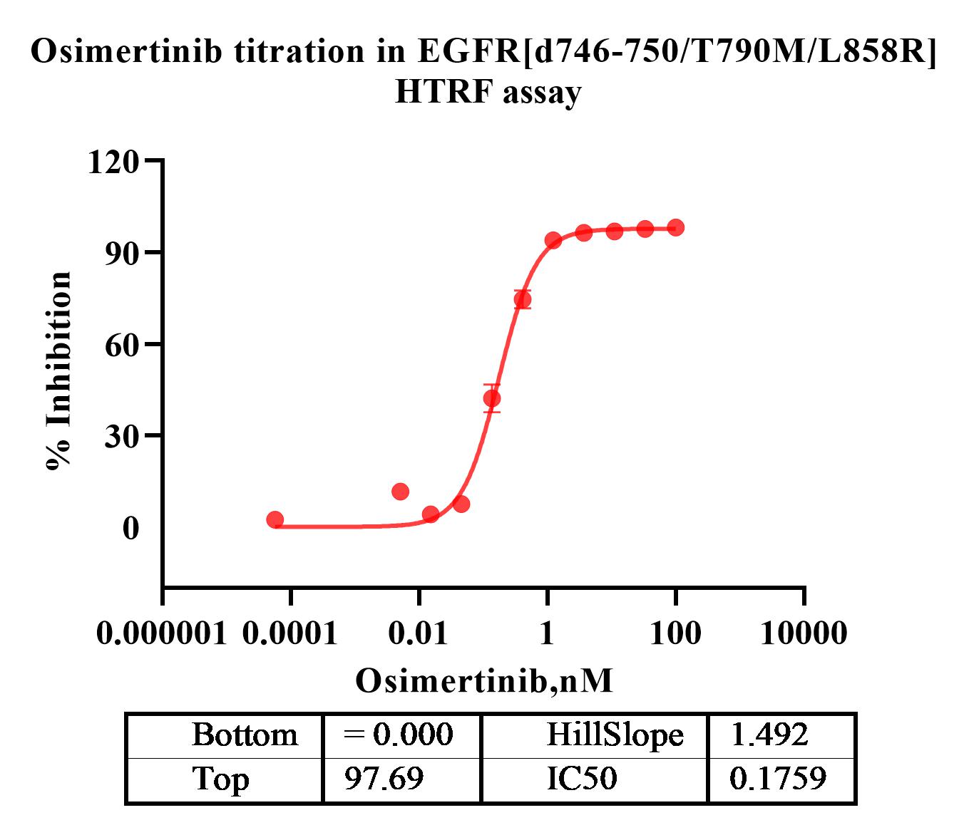 Activity Identification:The EGFR[d746-750/T790M/L858R] activity was detected using HTRF technology. The reaction was performed by incubating the EGFR[d746-750/T790M/L858R] protein, ATP and substrate at 25℃ for 60 min, adding the beads at 25℃ for 60 min, then reading ratio 665/620 with BMG.