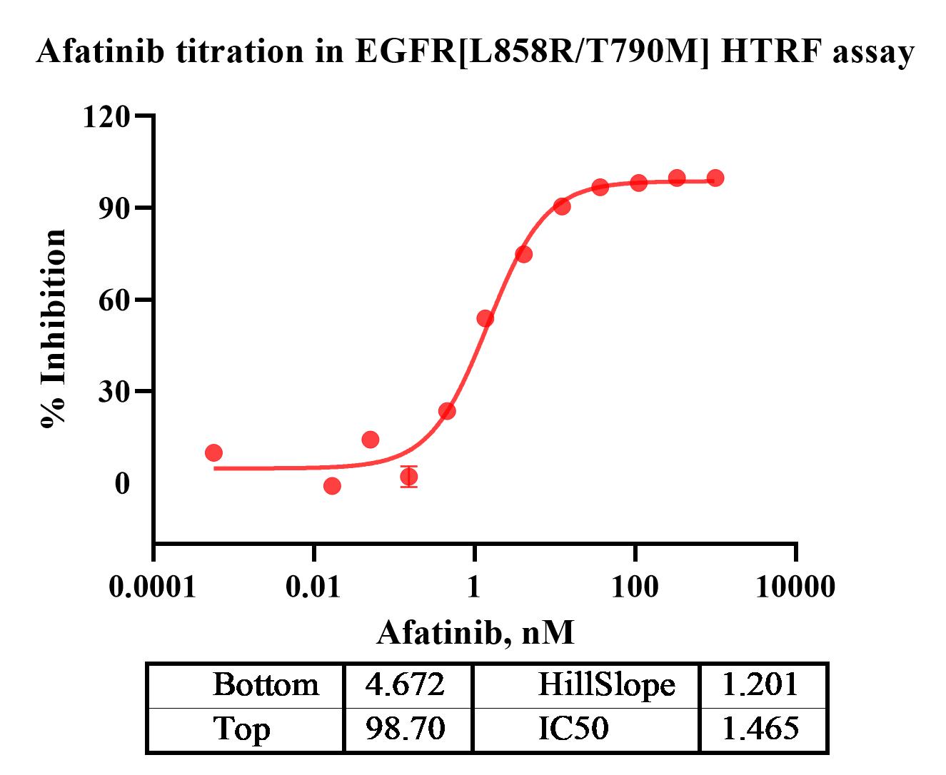Activity Identification:The EGFR[L858R/T790M] activity was detected using HTRF technology. The reaction was performed by incubating the EGFR[L858R/T790M] protein, ATP and substrate at 25℃ for 60 min, adding the beads at 25℃ for 60 min, then reading ratio 665/620 with BMG.
