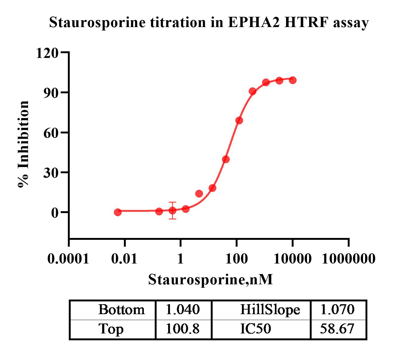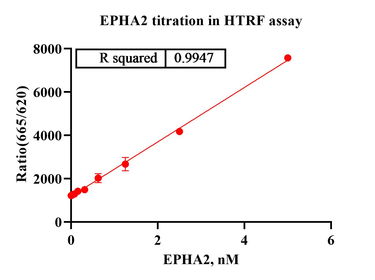 Activity Identification:The EPHA2 activity was detected using homogeneous time-resolved fluorescence technology. The reaction was performed by incubating the EPHA2 protein, ATP and substrate at 25℃ for 50 min, adding the beads at 25℃ for 60 min, then reading ratio 665/620 with BMG.