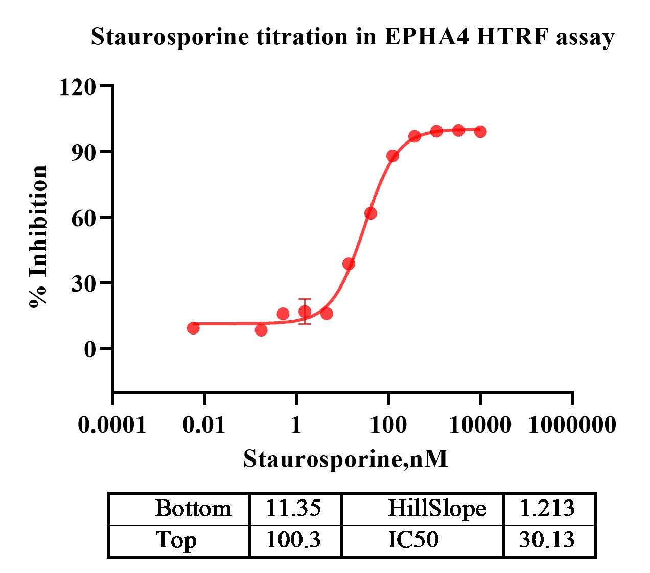 Activity Identification:The EPHA4 activity was detected using HTRF technology. The reaction was performed by incubating the EPHA4 protein, ATP and substrate at 25℃ for 60 min, adding the beads at 25℃ for 60 min, then reading ratio 665/620 with BMG.
