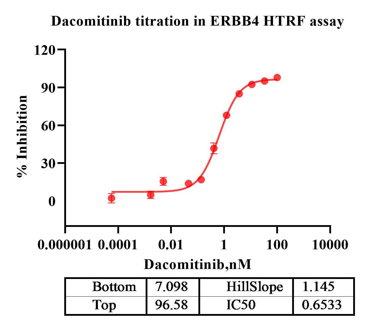 Activity Identification:The ERBB4 activity was detected using HTRF technology. The reaction was performed by incubating the ERBB4 protein, ATP and substrate at 25℃ for 60 min, adding the beads at 25℃ for 60 min, then reading ratio 665/620 with BMG.