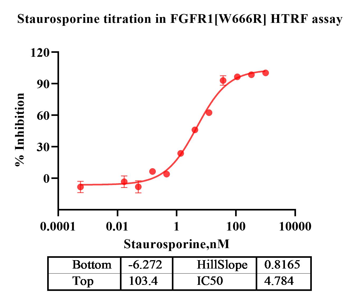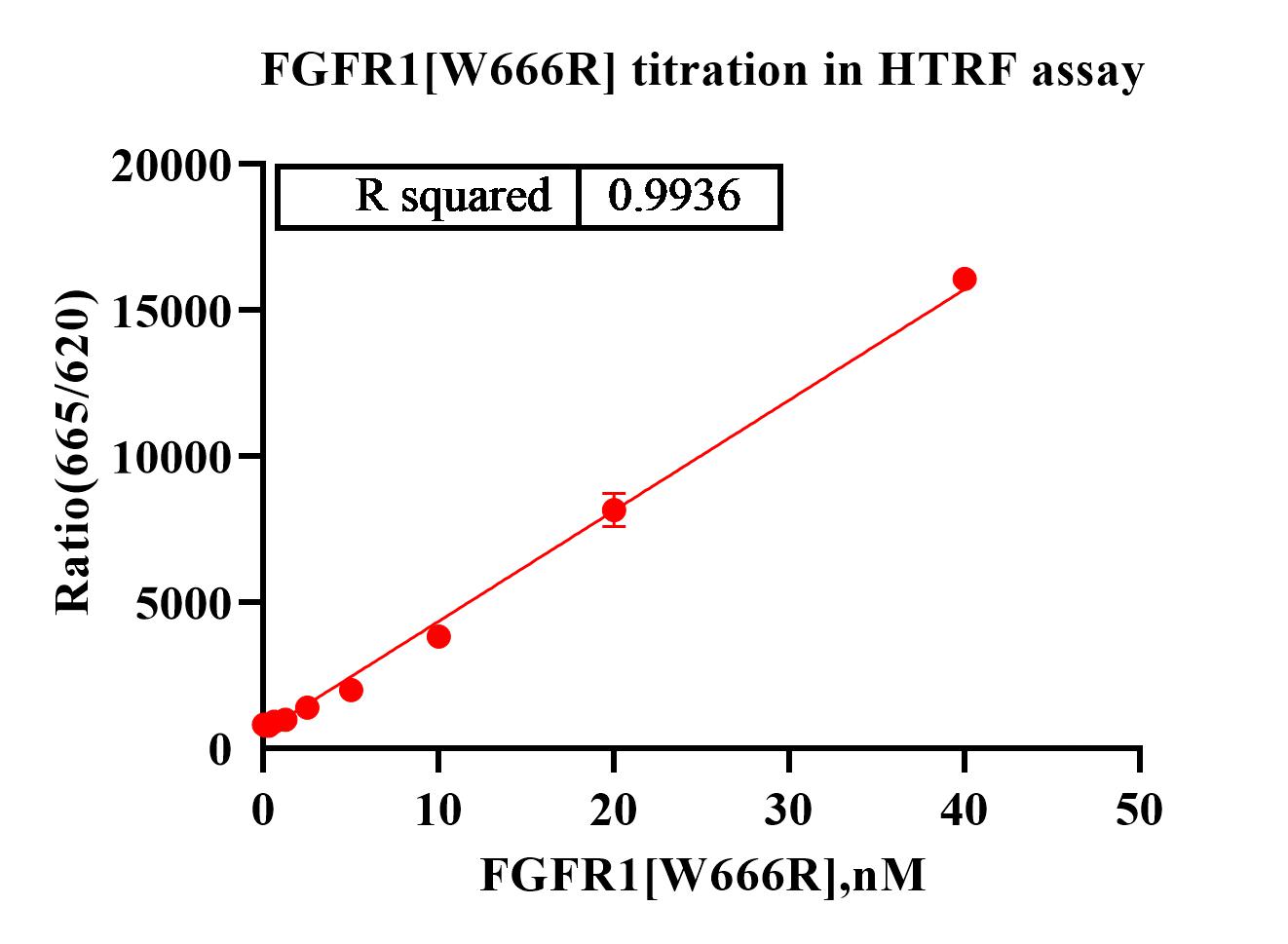 Activity Identification:The FGFR1[W666R] activity was detected using HTRF technology. The reaction was performed by incubating the FGFR1[W666R] protein, ATP and substrate at 25℃ for 60 min, adding the beads at 25℃ for 60 min, then reading ratio 665/620 with BMG.