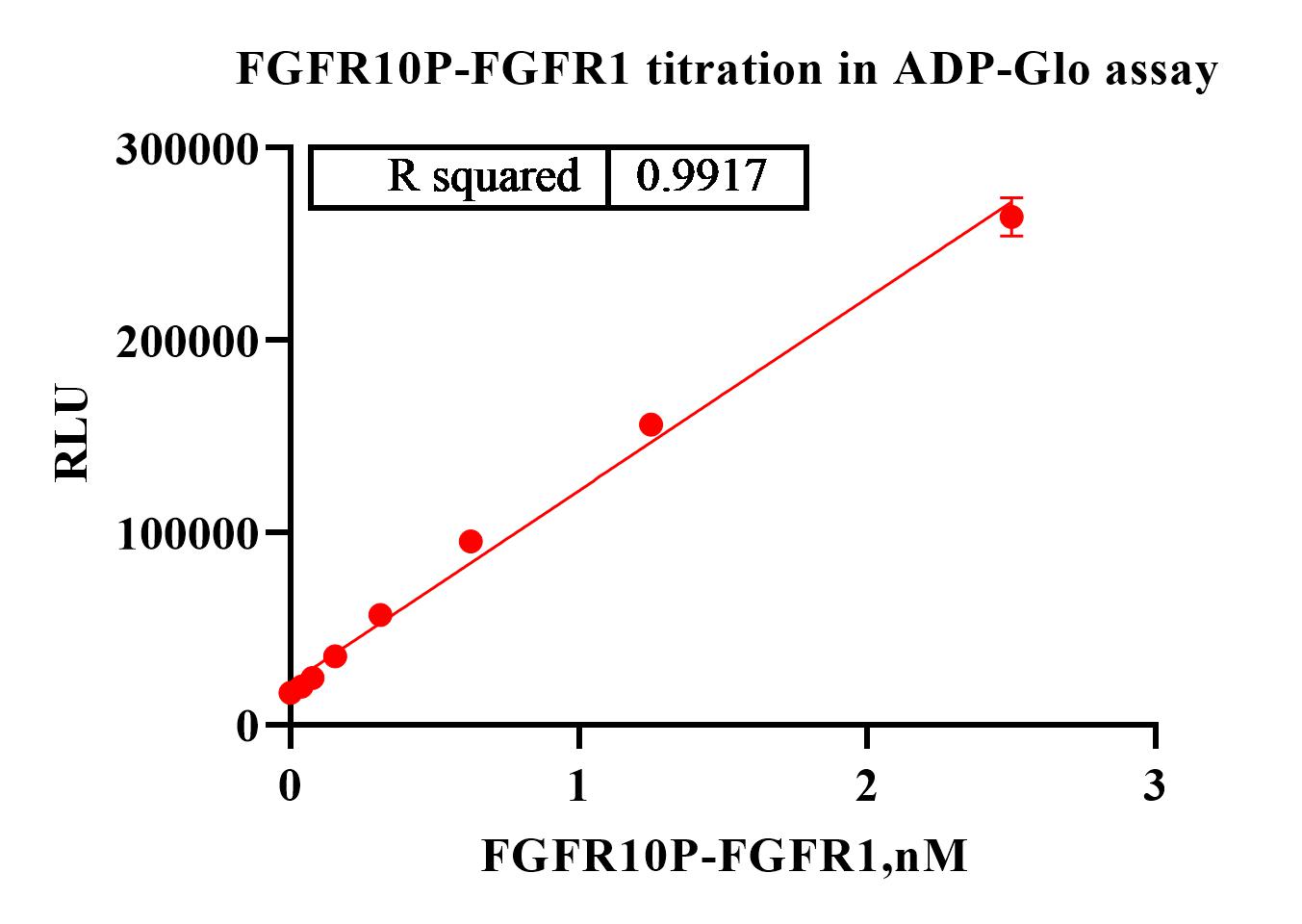 Description:Recombinant human FGFR10P-FGFR1 protein with N-terminal GST tag was purified by GST affinity and followed by SEC chromatography. The FGFR10P-FGFR1 protein showed good activity in ADP-Glo assay.