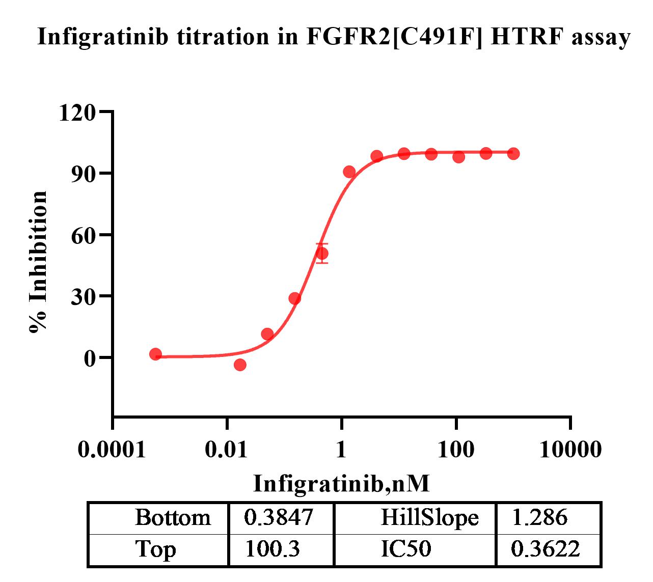 Activity Identification:The FGFR2[C491F] activity was detected using HTRF technology. The reaction was performed by incubating the FGFR2[C491F] protein, ATP and substrate at 25℃ for 60 min, adding the beads at 25℃ for 60 min, then reading ratio 665/620 with BMG.